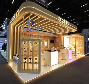 Design Minimalista e Elegante: O estande refletia a sofisticação da marca Delis, utilizando acabamentos de alta qualidade e uma paleta de cores que valorizava a luz em si.