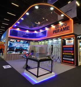 Perame: Sendo a primeira participação da Perame na Feicon, o maior desafio foi gerar inovação e impacto memorável para destacar a eficácia das telas de proteção. A Casanova concebeu uma abordagem ousada com a “Proteção Suspensa” – uma tela fixada no teto com um manequim, complementada por iluminação e telas de LED, para criar um espetáculo que gerasse engajamento e visibilidade massiva.