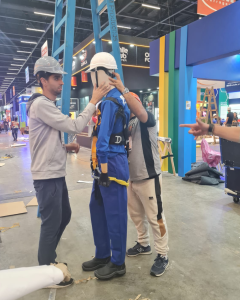 Tela de Proteção Fixada no Teto com Manequim: Uma tela de proteção foi dramaticamente fixada no teto do estande, simulando a segurança de uma pessoa (representada por um manequim) suspensa por ela.