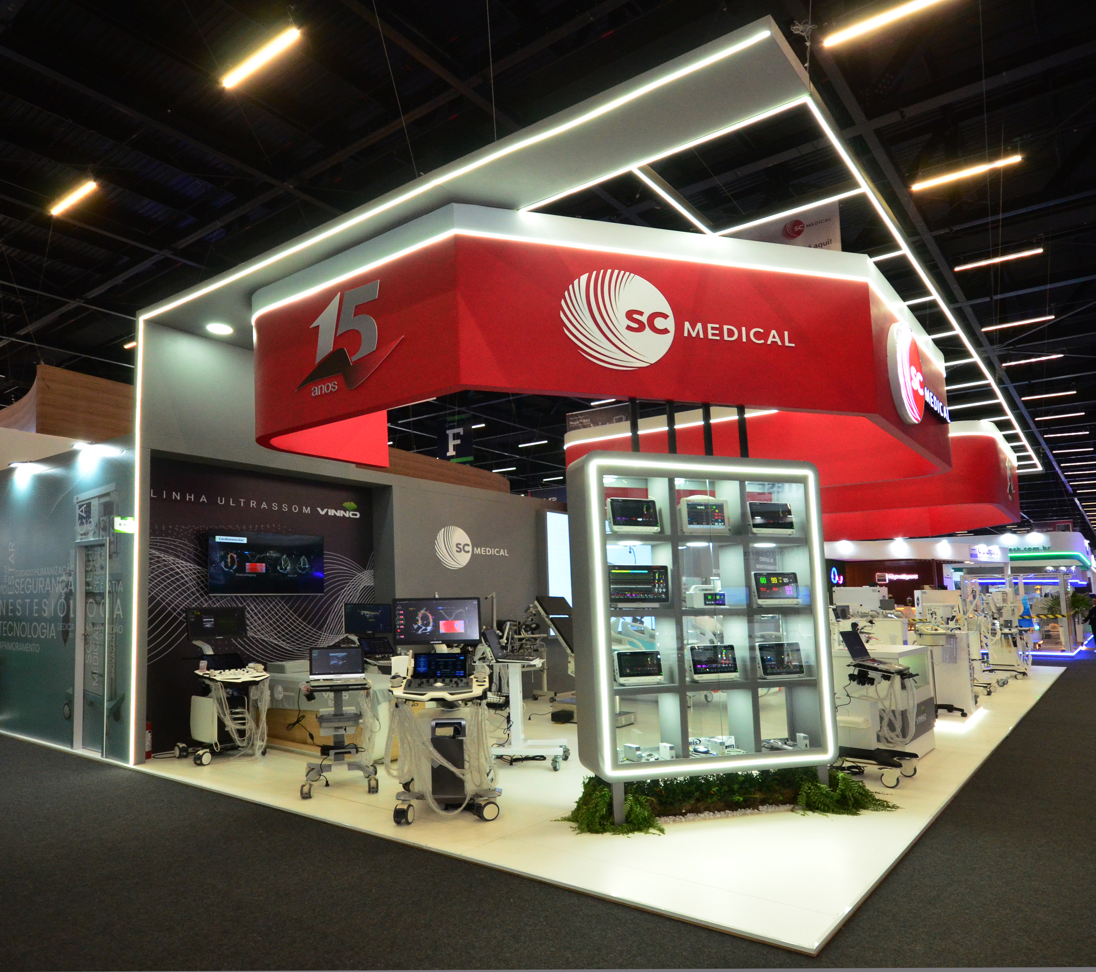 • SBUS (Sociedade Brasileira de Ultrassonografia): Estantes otimizados para a demonstração de equipamentos de ultrassom de alta performance, com estações de trabalho e telas auxiliares para visualização detalhada.